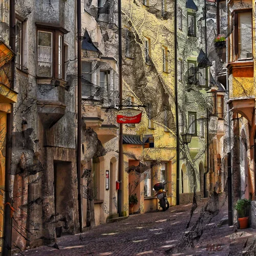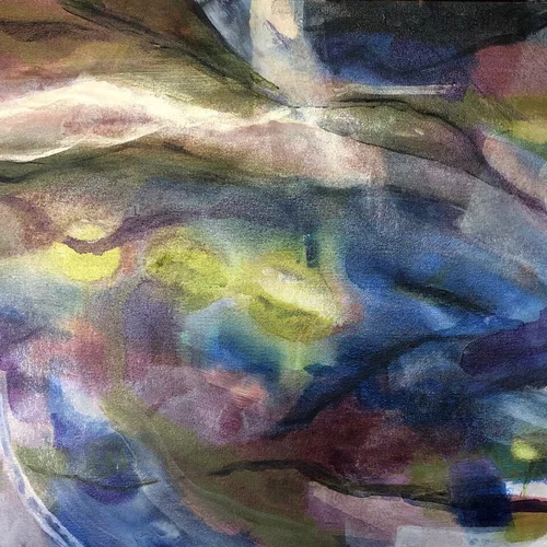I start an artwork with a flood of water and pigment across a horizontal unprimed canvas. Then come shapes and lines with paint and ink, layer upon layer. Often the imagery takes a mixed media detour into the digital domain. Those ventures yield embellished prints, collages, and illuminated transparent multilayered glowing images.